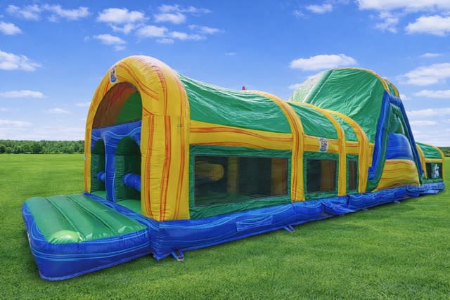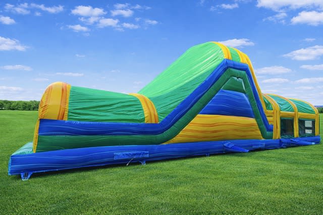 This is a brand new and upgraded obstacle course for 2026 it contains all the thrills and spills of a assault course of this size but it boasts an 9ft high slide this castle is suitable for wide age range from the younger kids right upto teenagers and even adults.